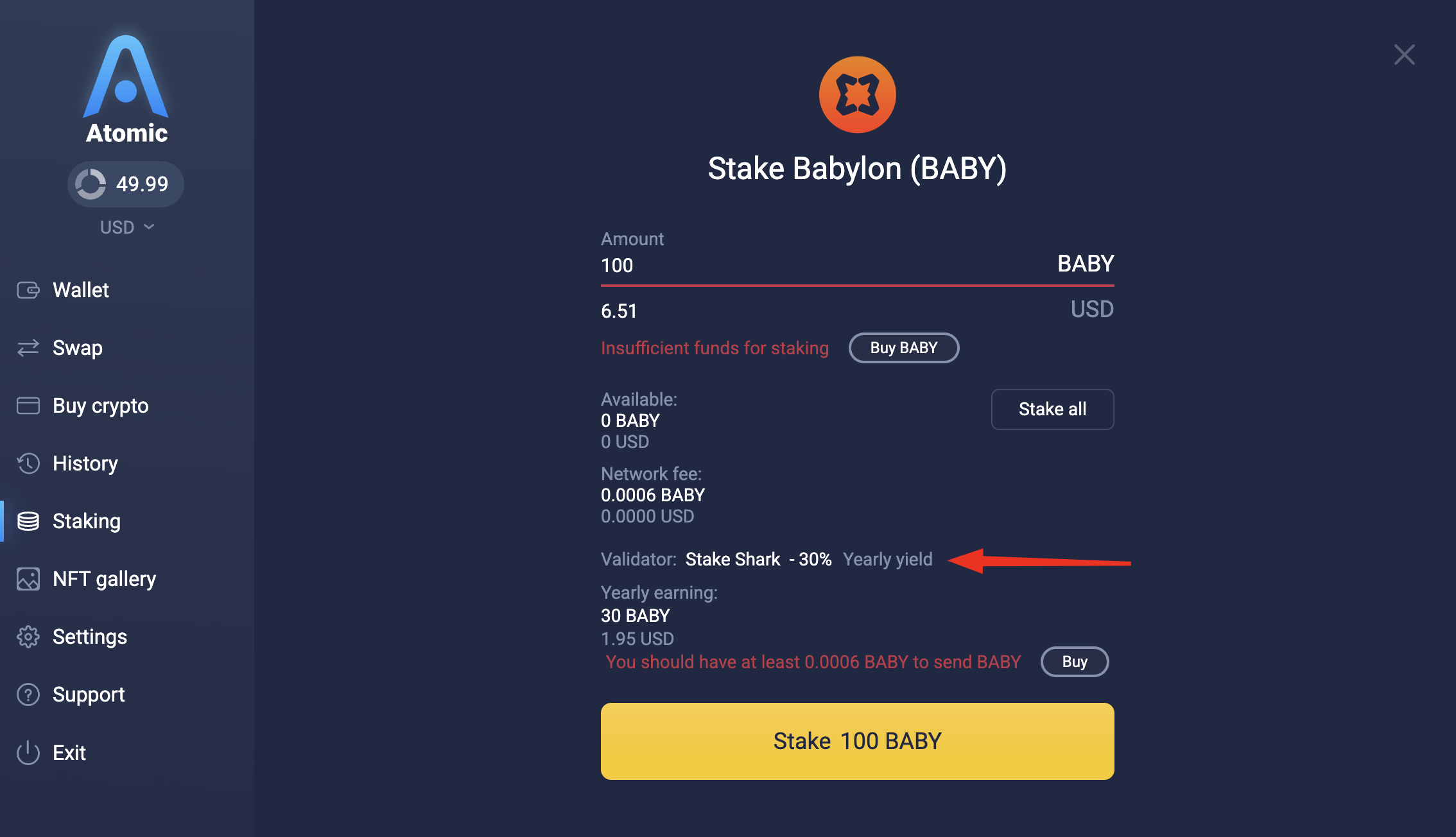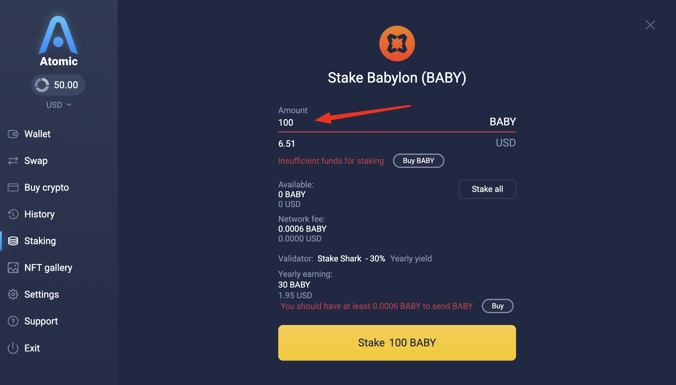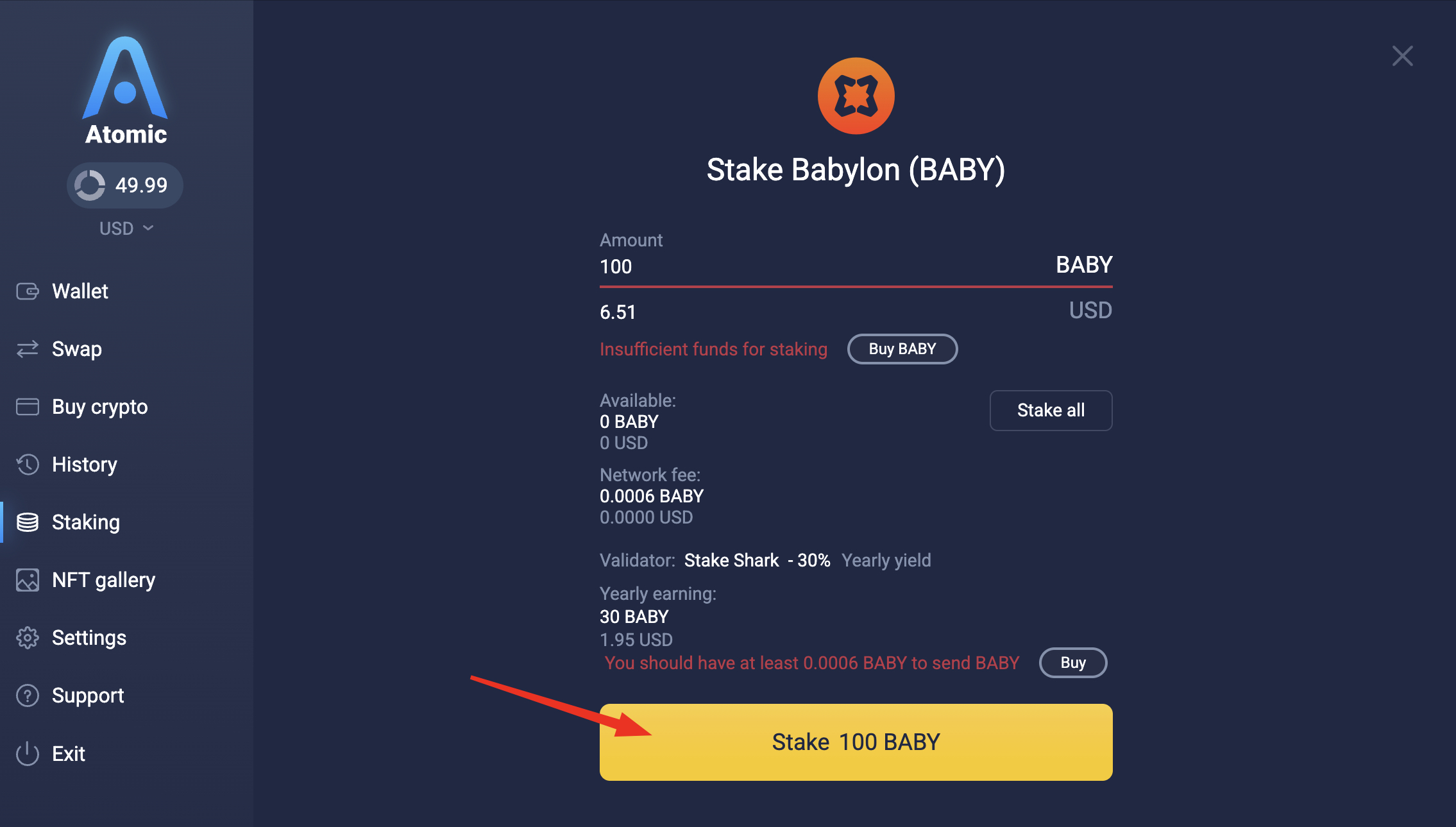 - You’ll have to pay a network fee every time you want to stake, claim some rewards, or unstake your BABY. Make sure to leave some small BABY amount (that is, at least 0.0006) on your available balance, so that you can pay the fees. Otherwise, you won’t be able to either claim your rewards or unstake your coins. For more details about the network fees, see Does Atomic Wallet charge any additional transaction fees