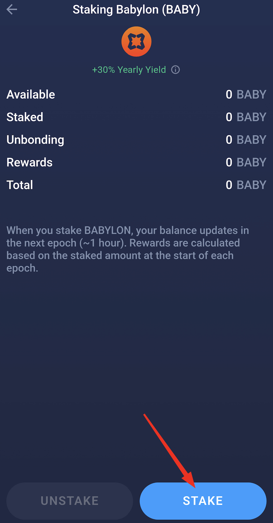 Also, 1 BABY must always remain staked due to blockchain rules. When planning to unstake, make sure you leave at least 1 BABY behind, or your transaction will be rejected.