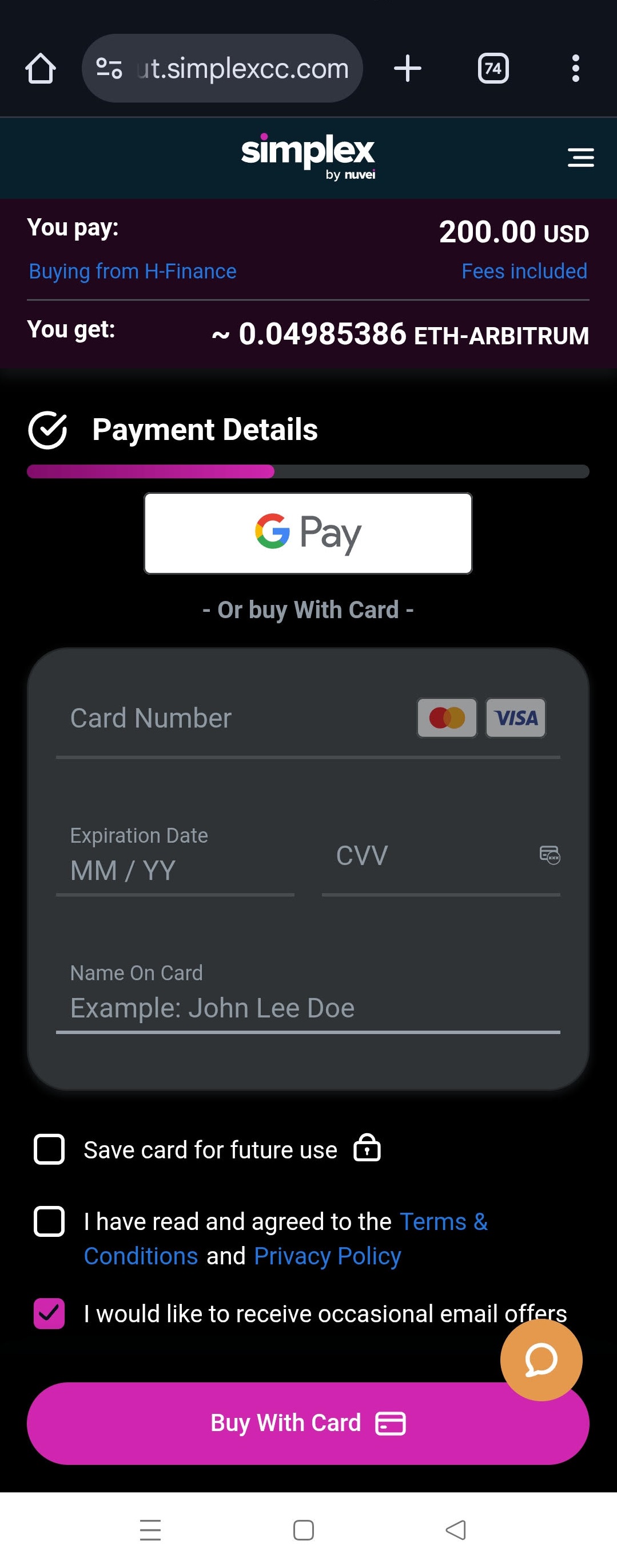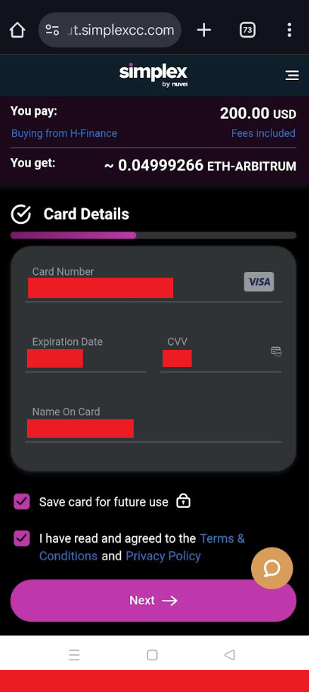 Please note: although all the fees are included in the estimated amount, the final amount can vary under the market conditions and fees charged by a specific credit card bank. If there are any drastic market fluctuations, Simplex is sending a warning email about the change in the final amount. Then you’ll be free to decline the purchase.