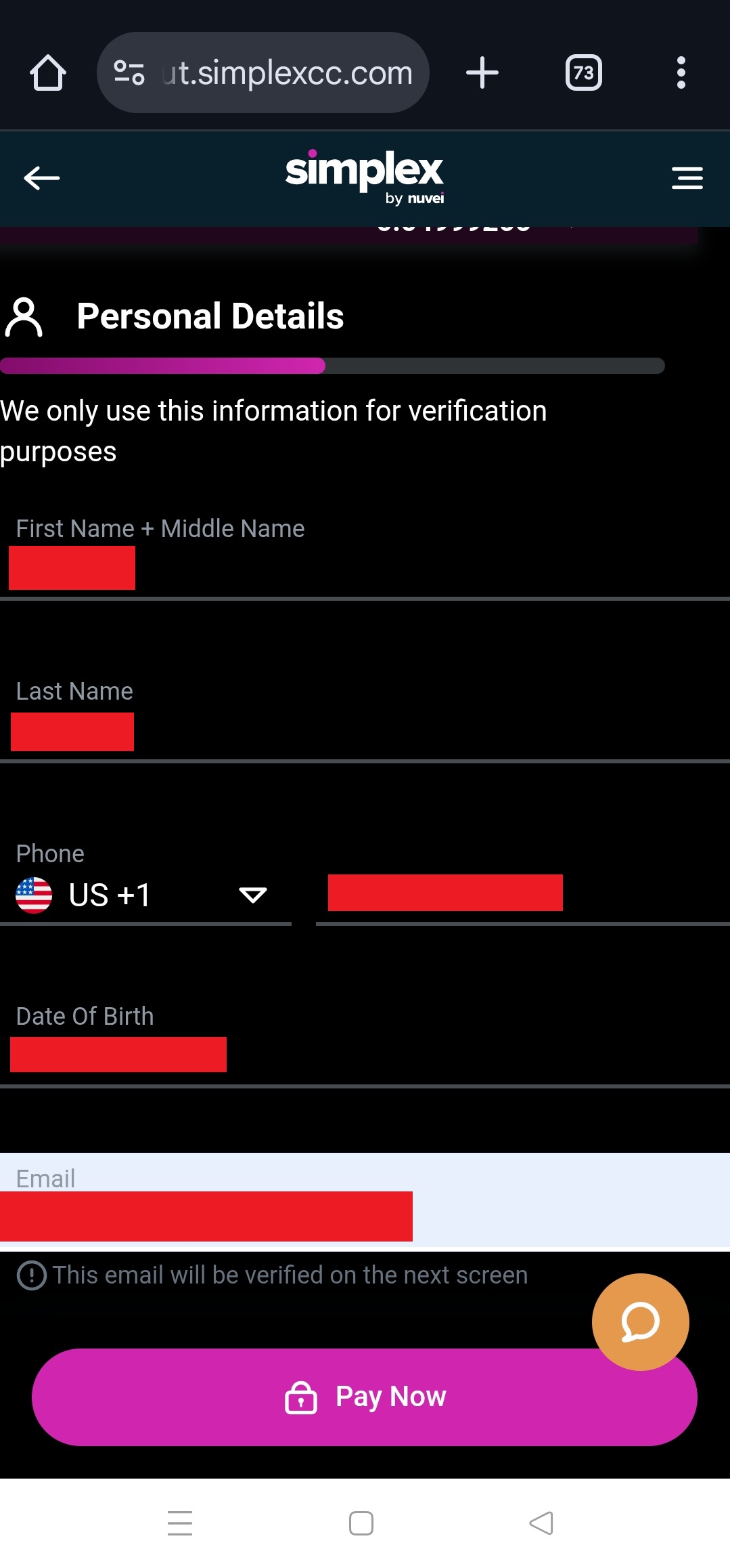 - You will see a form from our partner Simplex. Fill in your billing information, and personal details. Click 'Pay Now' when you're done;